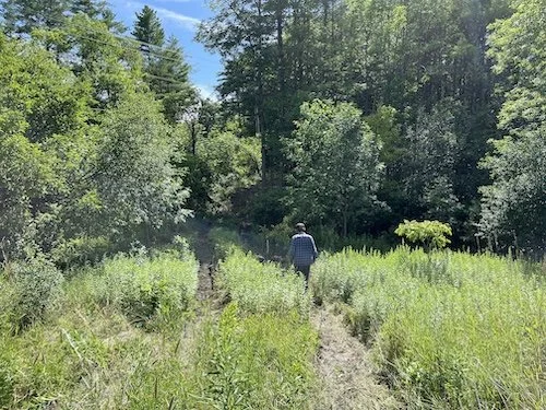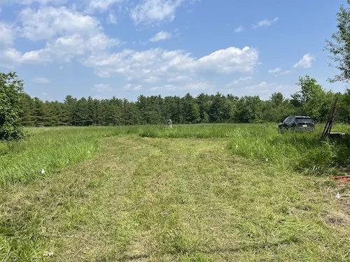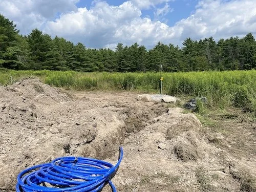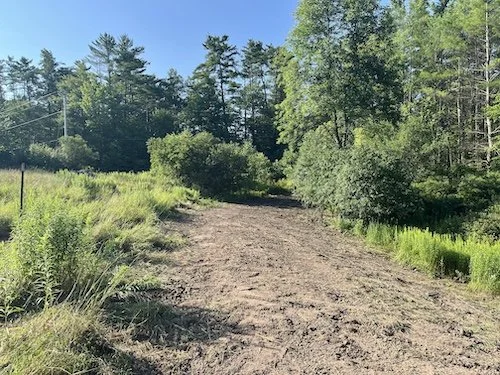 We met with our excavator operators and the Town staff onsite the morning of ground breaking and came to the conclusion that the more affordable path was to bring the water from up the road a couple hundred feet to the edge of our property, even though the distance was significantly lengthened to get the water to where we could actually use it. From there we would clear a path along the edge of the forest to bring the water line into our field and house area. We walked the route with our excavator operators and charted a course that eliminated the need to remove any trees except a single, mostly dead, old apple tree.